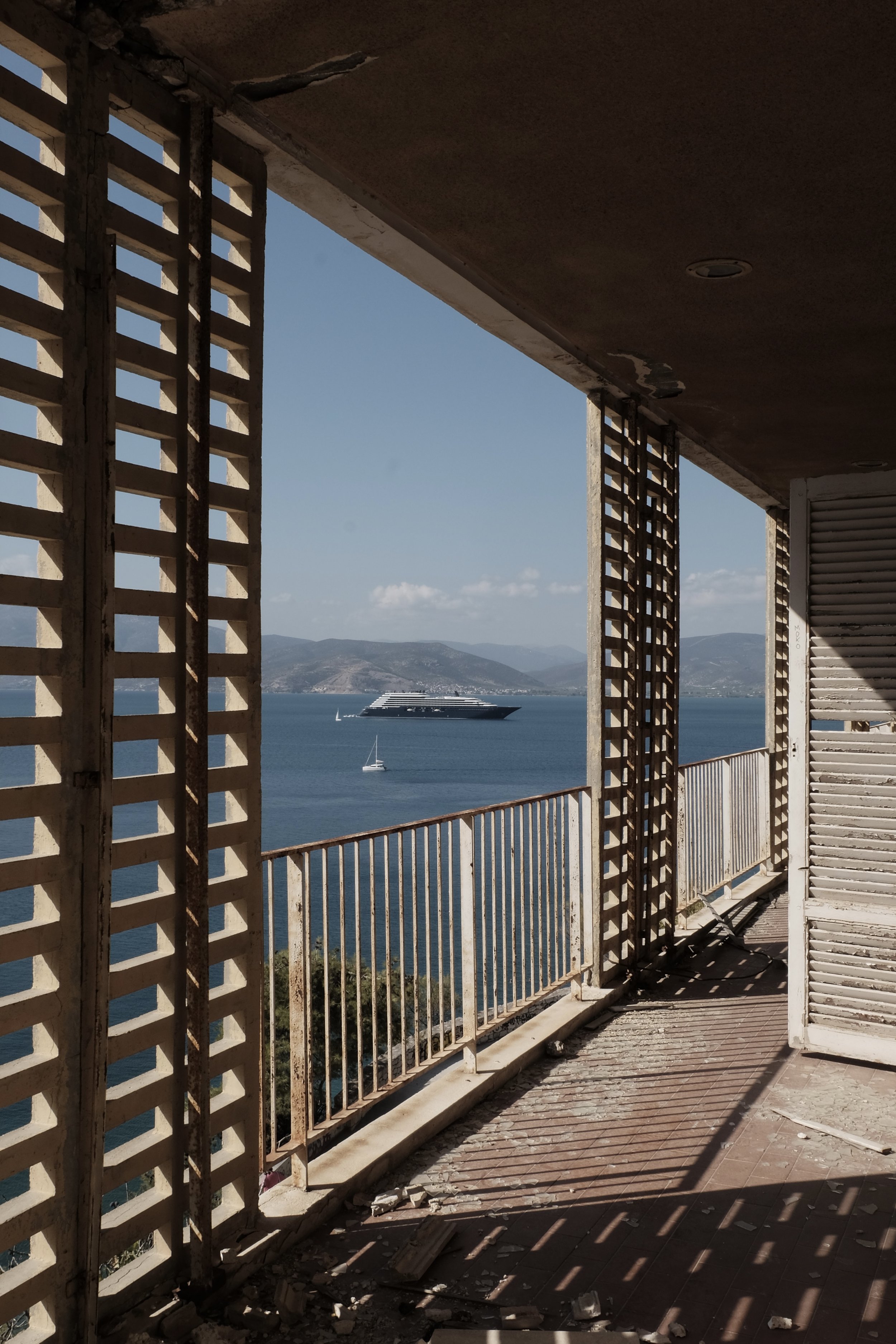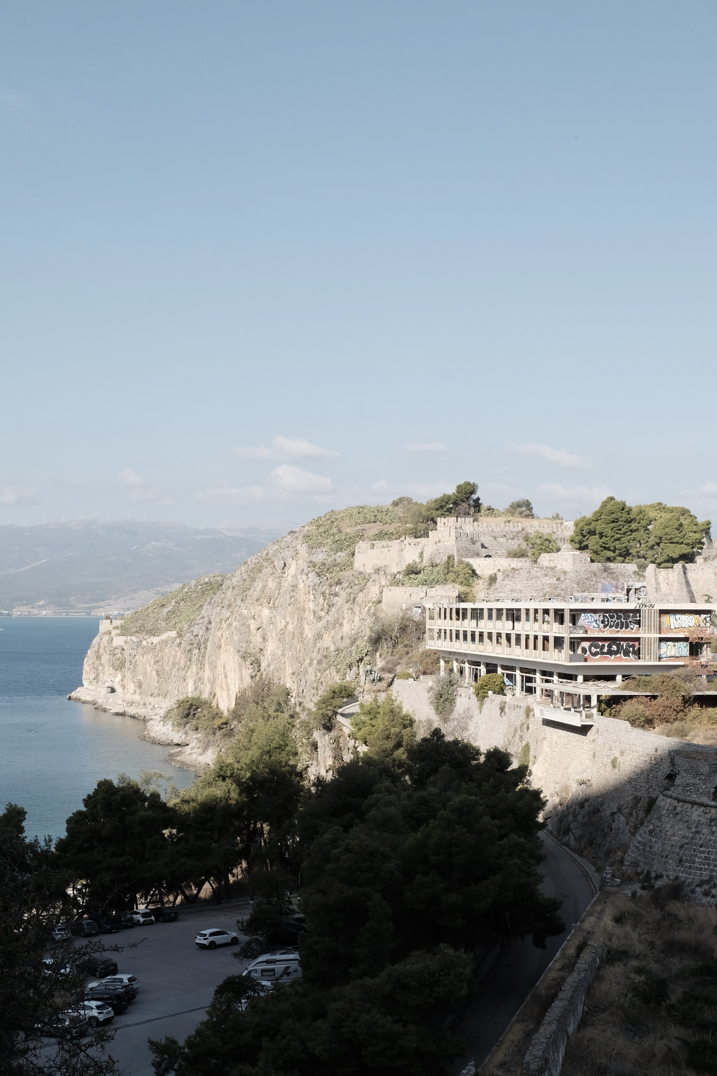 Nach dem Abstieg zieht die Neugier mich in das verlassene Hotel Xenia. Wohl seit über 20 Jahren leerstehend, gleicht es einem Rohbau mit Verfallserscheinungen. Inzwischen thront der moderne Betonbau als eine Art Wahrzeichen zwischen dem Palamidi-Berg und Akronafplia, einer weiteren Befestigungsanlage oben auf der kleinen Halbinsel. Sie erinnerte mich instinktiv an die in Alanya, wo sich auch eine Festung oben befindet. Das verlassene Hotel ist von so gut wie überall sichtbar und war in der Vergangenheit Gegenstand vieler politischer Debatten in Griechenland. Inzwischen ist es so heruntergekommen, dass sich kein Investor findet. Doch die grundlegende Bausubstanz scheint vertrauenswürdig, und mit gebotener Vorsicht streune ich durch ehemalige Hotelzimmer, das Treppenhaus, die Hotel-Lobby und Terrassen. Der Ausblick zur Südseite ist unglaublich. Ein großes Kreuzfahrtschiff sowie ein Dreimaster liegen weiter draußen den ganzen Tag vor Anker und geben herrliche Fotomotive ab. So schnell, wie ich gekommen bin, verschwinde ich auch wieder – ein paar leeren Fensterrahmen sei Dank.